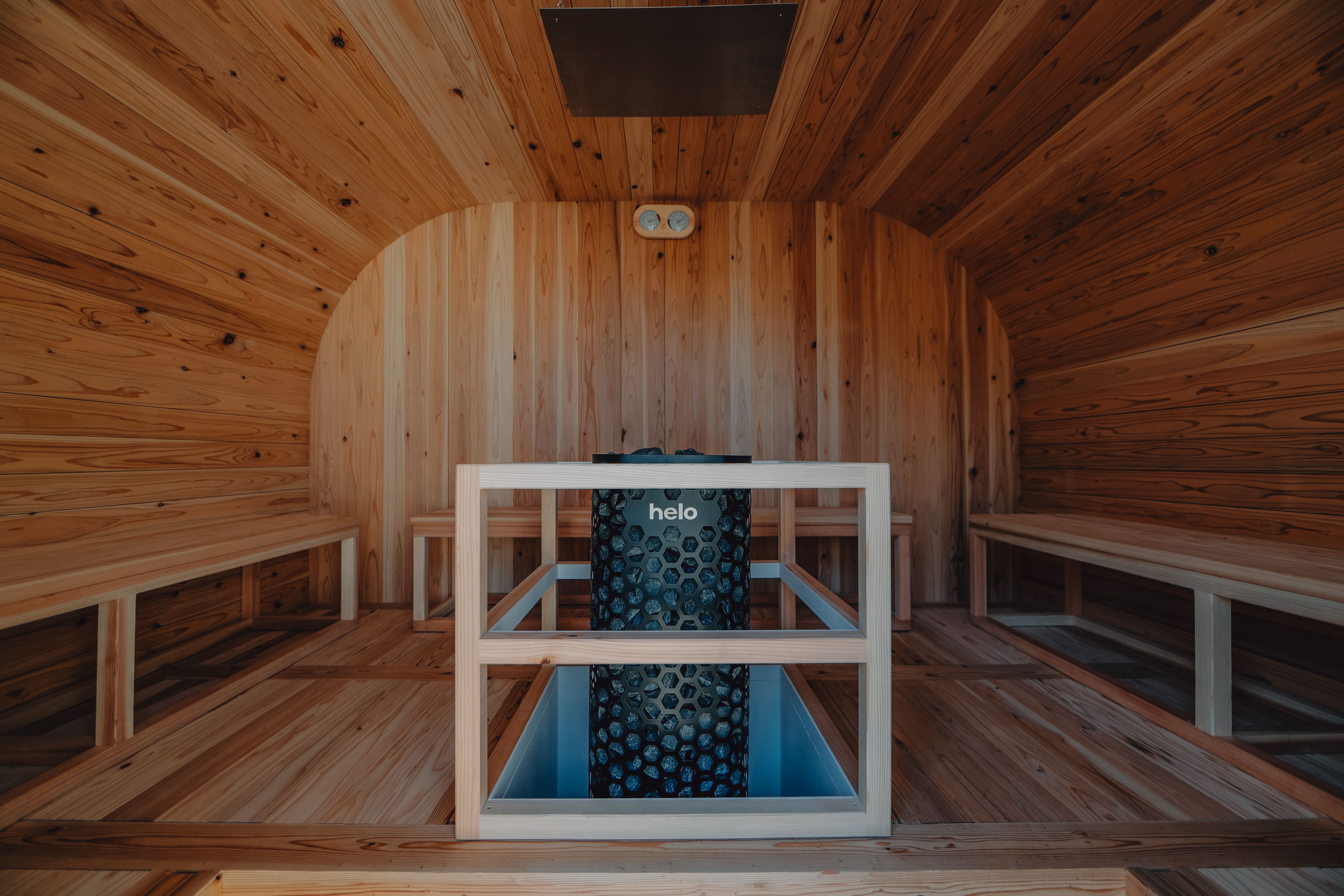 樽型の形状で、宮崎の杉をふんだんに使って作られたサウナは
