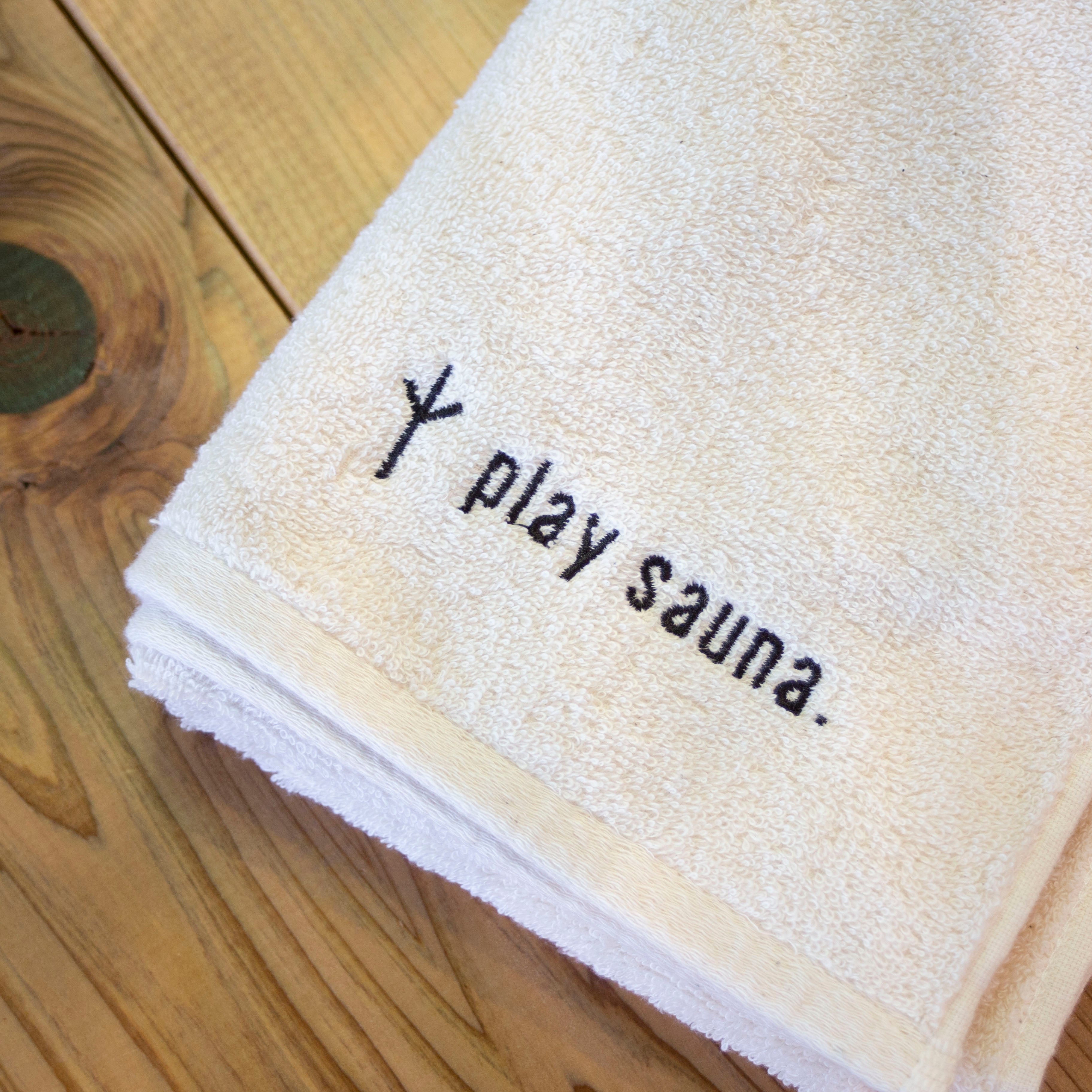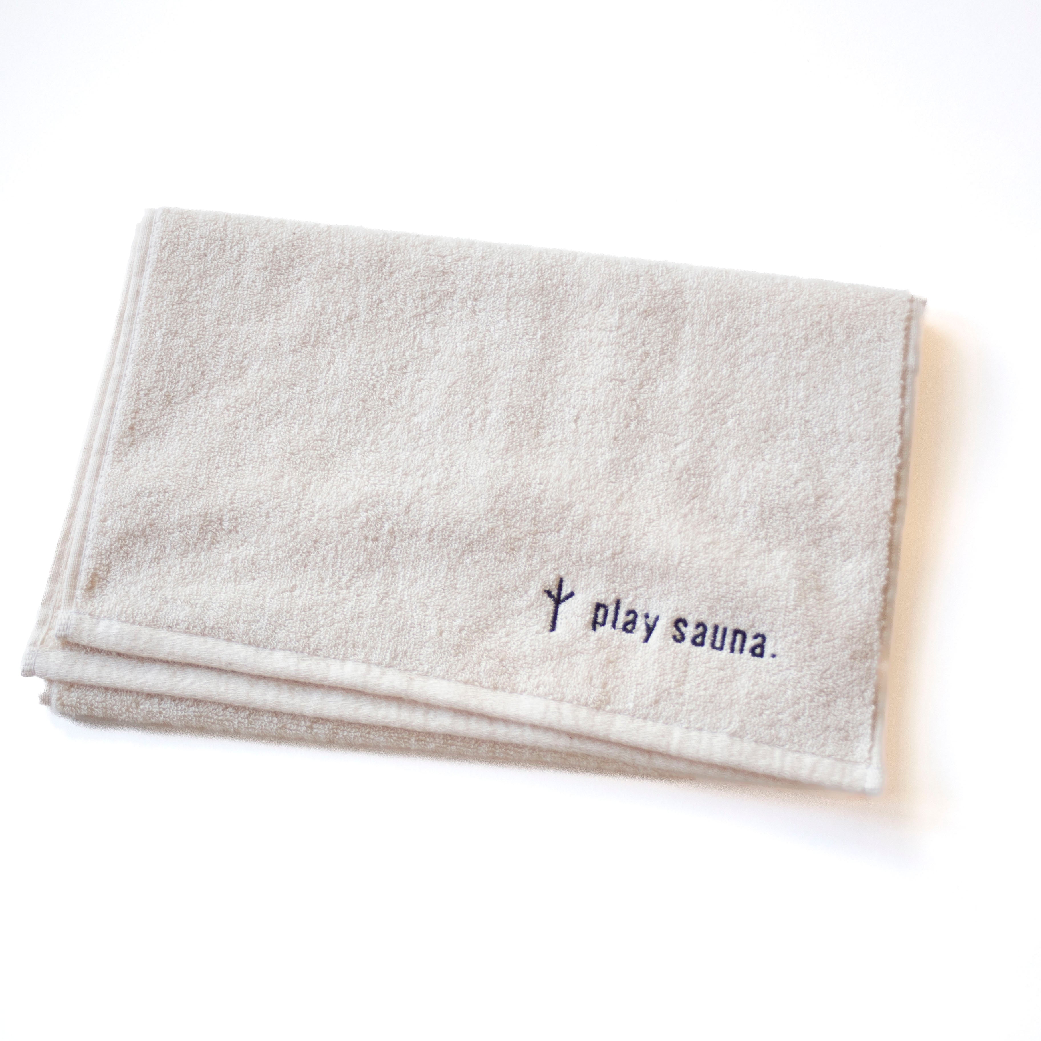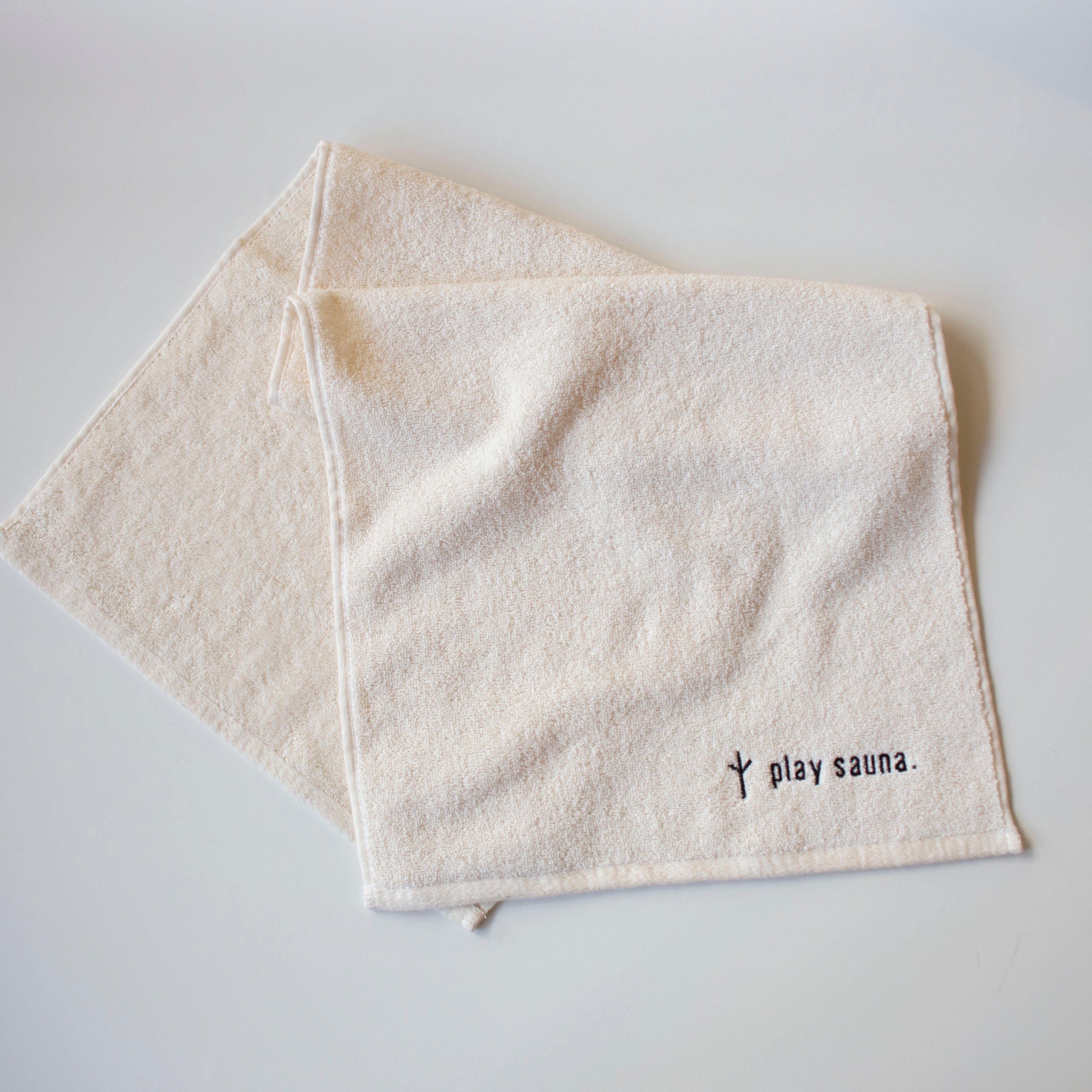 無染色、ナチュラルカラーのplay saunaロゴの刺繍が入った今治タオルです。