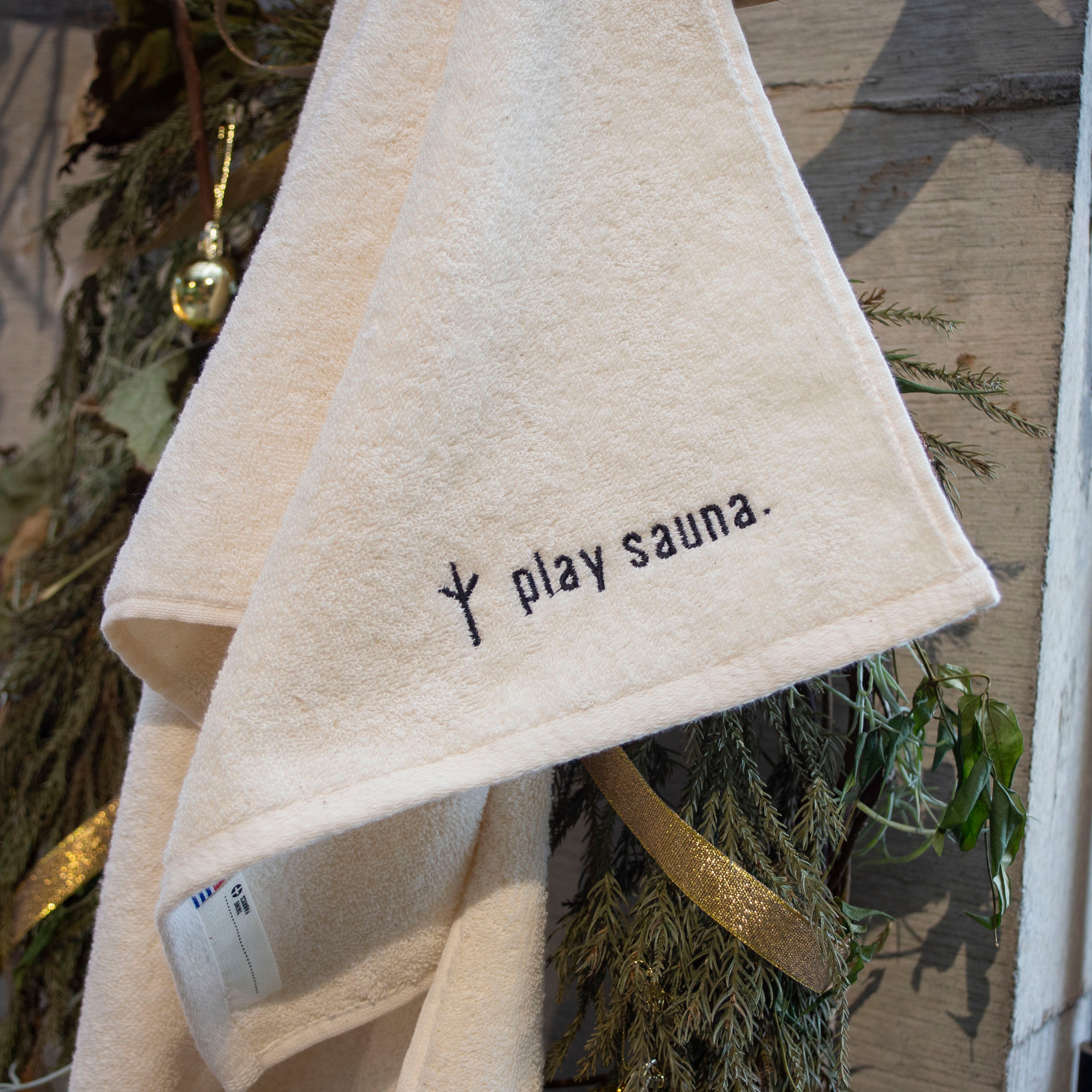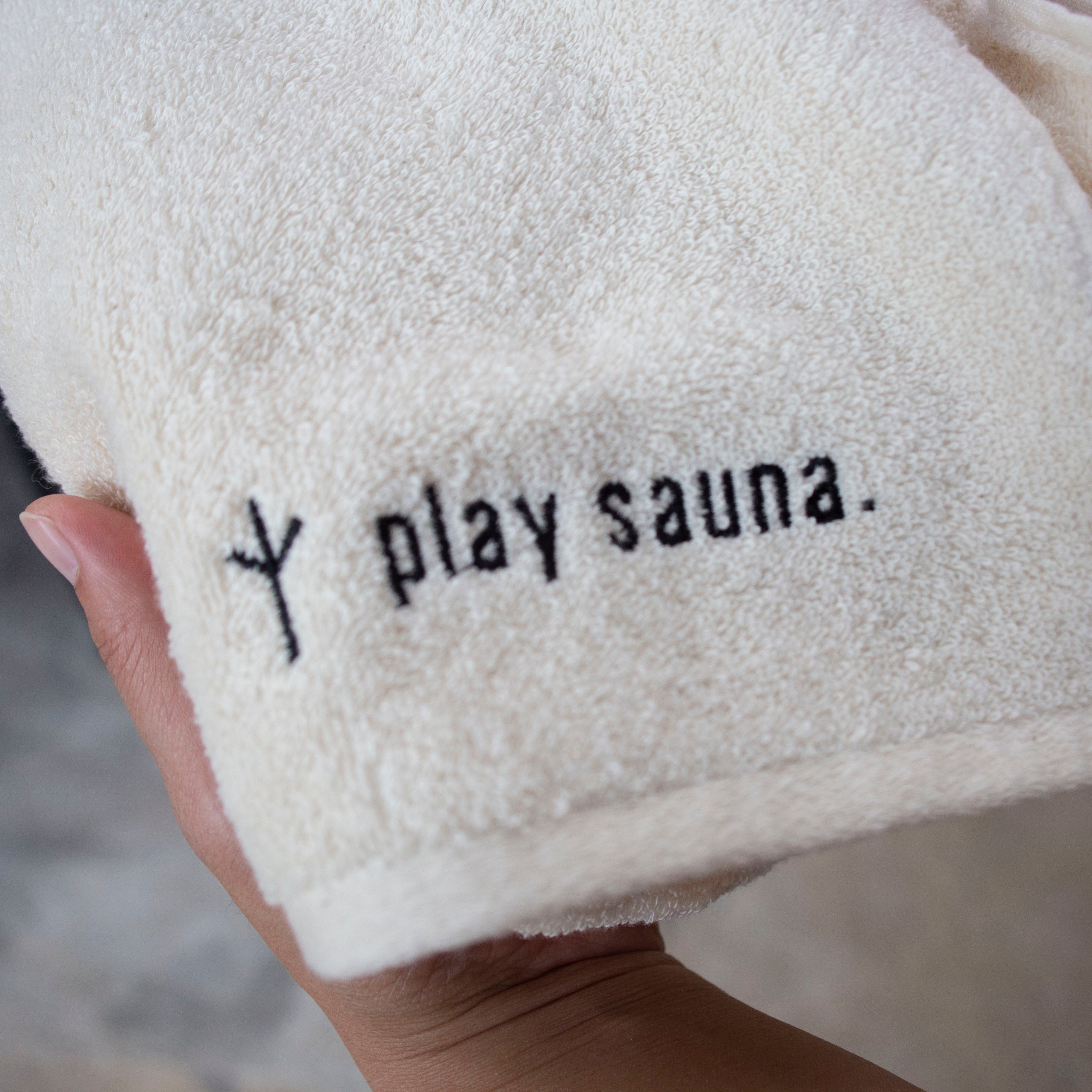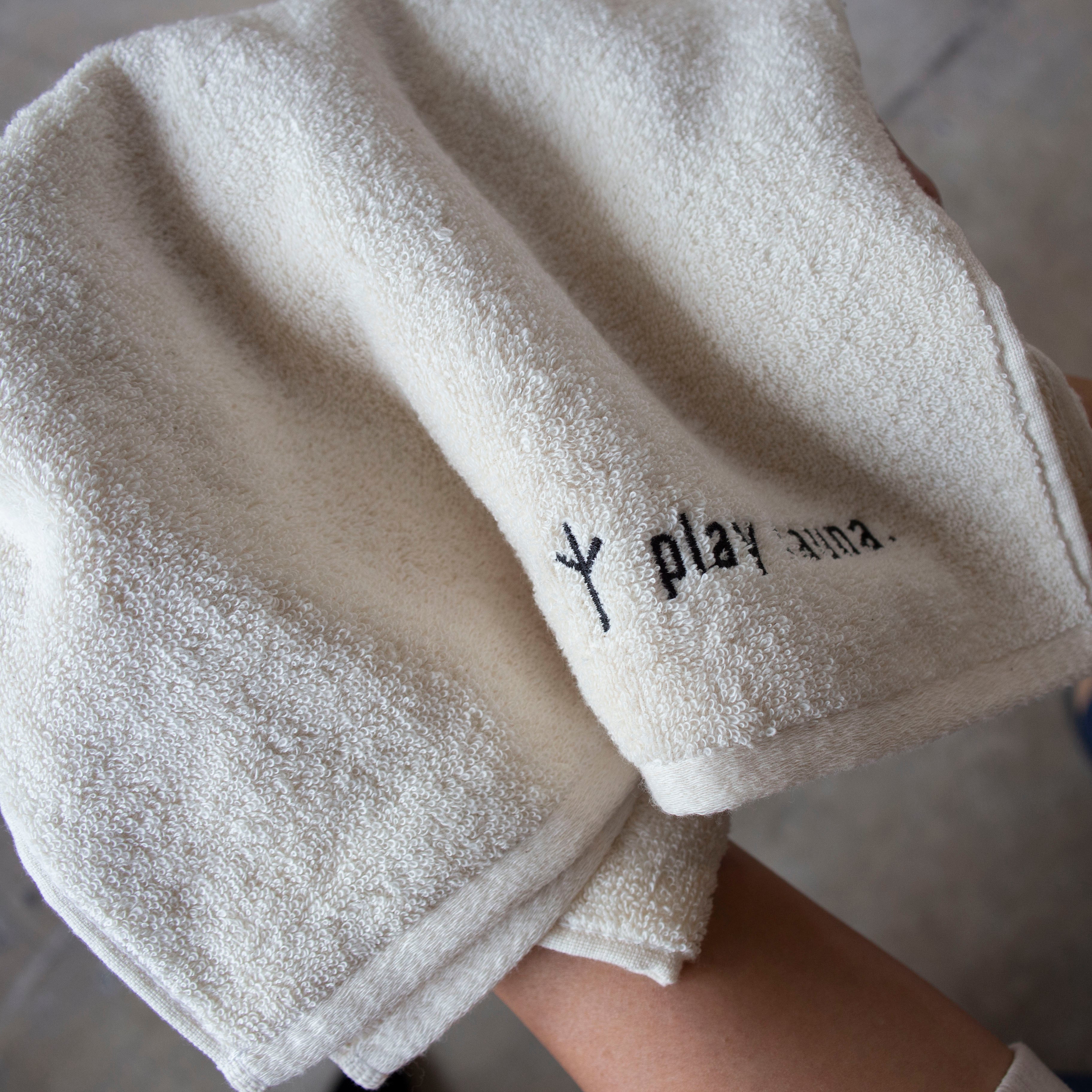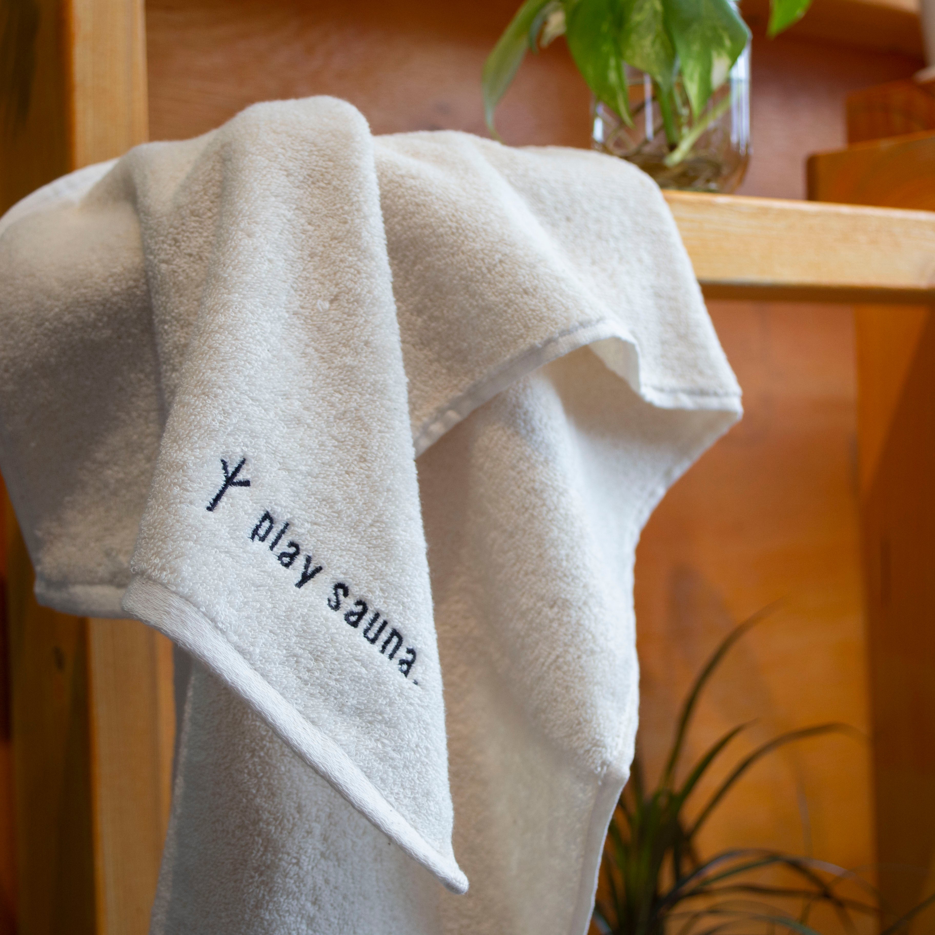 無染色、ナチュラルカラーのplay saunaロゴの刺繍が入った今治タオルです。